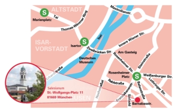 Al centro di Monaco: L’ostello Jugendgästehaus Don Bosco fa parte del pensionato per giovani Salesianum e si trova in un punto centrale nel quartiere di Monaco Haidhausen. Potete arrivare alla fermata della S-Bahn Rosenheimer Platz in 5 minuti a piedi (Linee S1 –S8 e da li sono 6 minuti fino alla stazione centrale Hauptbahnhof e 3 minuti fino al Marienplatz). Potete raggiungerci facilmente con i mezzi pubblici, in auto o con l’autobus.